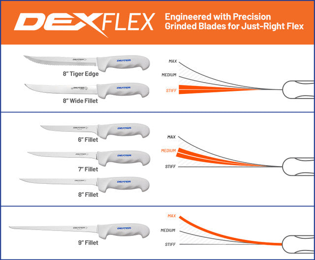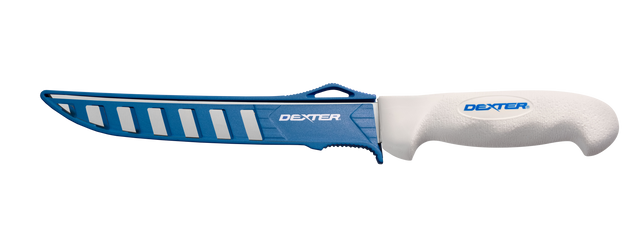 The Dexter SG138EG 8” wide fillet knife makes filleting and skinning your fish easy. It’s ultra-sharp out of the package with a wide, stiff blade to glide over the bones. It features our SOFGRIP™ handle that is soft to the grip and provides great control along with slip resistance. It features our proprietary high carbon, high alloy, stain free DEXSTEEL™. This knife is NSF certified and is made in the U.S.A. This knife comes with our Edge Guard blade protector.